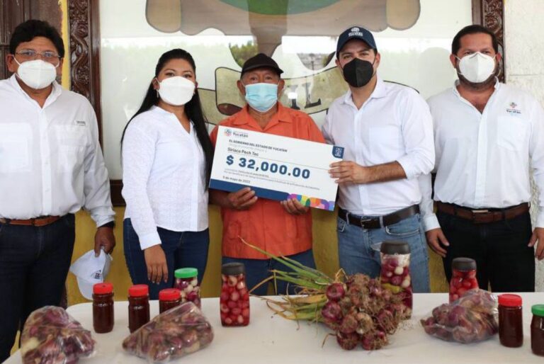 Ixil, Yucatán, 6 de mayo de 2022.- La ayuda que tanto esperaba José Felipe Chim Cocom para impulsar el cultivo de las cebollitas de Ixil en sus tierras, tras las afectaciones por el paso de huracanes y tormentas, llegó a sus manos al iniciar el gobernador Mauricio Vila Dosal la entrega de apoyos económicos para el estímulo a la producción en beneficio de hombres y mujeres dedicados a la siembra de esta hortaliza que tanto identifica a esta población.